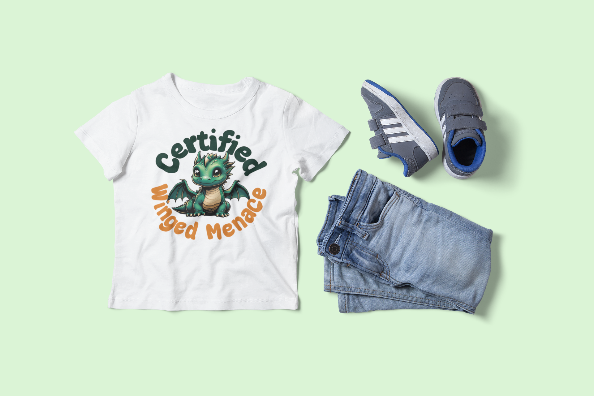 🔥 Let your little dragon fan show off their mischievous side with this adorable yet fierce "Certified Winged Menace" t-shirt! Featuring a charming baby dragon with big, expressive eyes and shimmering emerald wings, this tee is perfect for kids who love fantasy, mythical creatures, and a little bit of attitude.